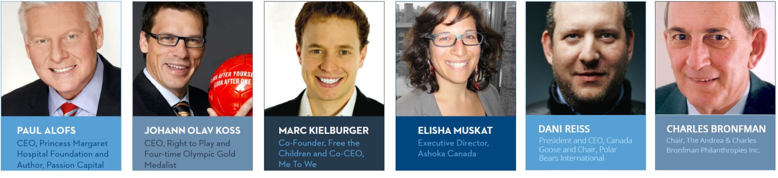 Our past speakers: Jordan Banks (Facebook Canada), Dave Wilkin (10thousandcoffees.com),  Dani Reiss (CEO Canadian Goose),  Paul Alofs (CEO Princess Margaret Hospital Foundation, former CEO of HMV Canada and CEO Disney retail worldwide) , Mark Keilburger (Co-Founder, Free the Children and Co-CEO, Me To We), Johann Olav Koss (CEO, Right to Play and Four-time Olympic Gold Medalist),  and Charles Bronfman.
